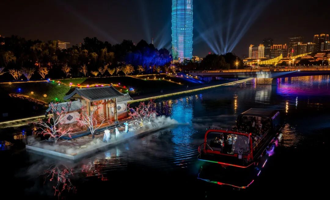 自2024年8月亮相以来,这场水上盛宴从最初1.0版本的5幕演出,升级为如今2.0版本的12幕演出,集灯光、音响、水幕、激光投影、三维投影、实景真人演出于一体。从甲骨文的源起,到唐宋诗词的辉煌,再到少林武学精神,这些与河南这片热土息息相关的文化元素被巧妙地融入5.2公里的水域游览带中,为观众带来一场穿越古今的沉浸式体验。作为郑州市区唯一的常态化水上夜游项目,它不仅仅是一场简单的游船观光,更是一幅流动的、沉浸式的中原历史文化画卷。