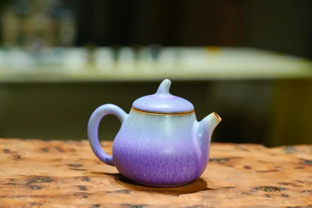 作品器型设计以茄瓜为形,线条饱满圆润,壶身从肩至底缓缓收束,兼具灵动与稳重;壶钮小巧精致,与壶身的柔和曲线相映成趣,执握斟茶时手感温润贴合。釉色采用任晓飞独创钧瓷窑变紫光釉,月白为底,紫光自壶底向上晕染漫延,纹理如丝如缕,自然天成,尽显“入窑一色,出窑万彩”的钧瓷神韵。