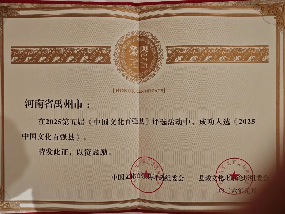 2026年元月15日至16日,第五届《中国文化百强县》新闻发布会、颁奖典礼暨主题论坛如期在北京大学举行。一批在文化传承与创新发展领域表现突出的县及县级市荣登榜单。 其中,河南省共有5个县市入选,分别为登封市、沁阳市、禹州市、淅川县、浚县,禹州市作为许昌市唯一入选的县市,凭借深厚文脉与扎实实践脱颖而出。