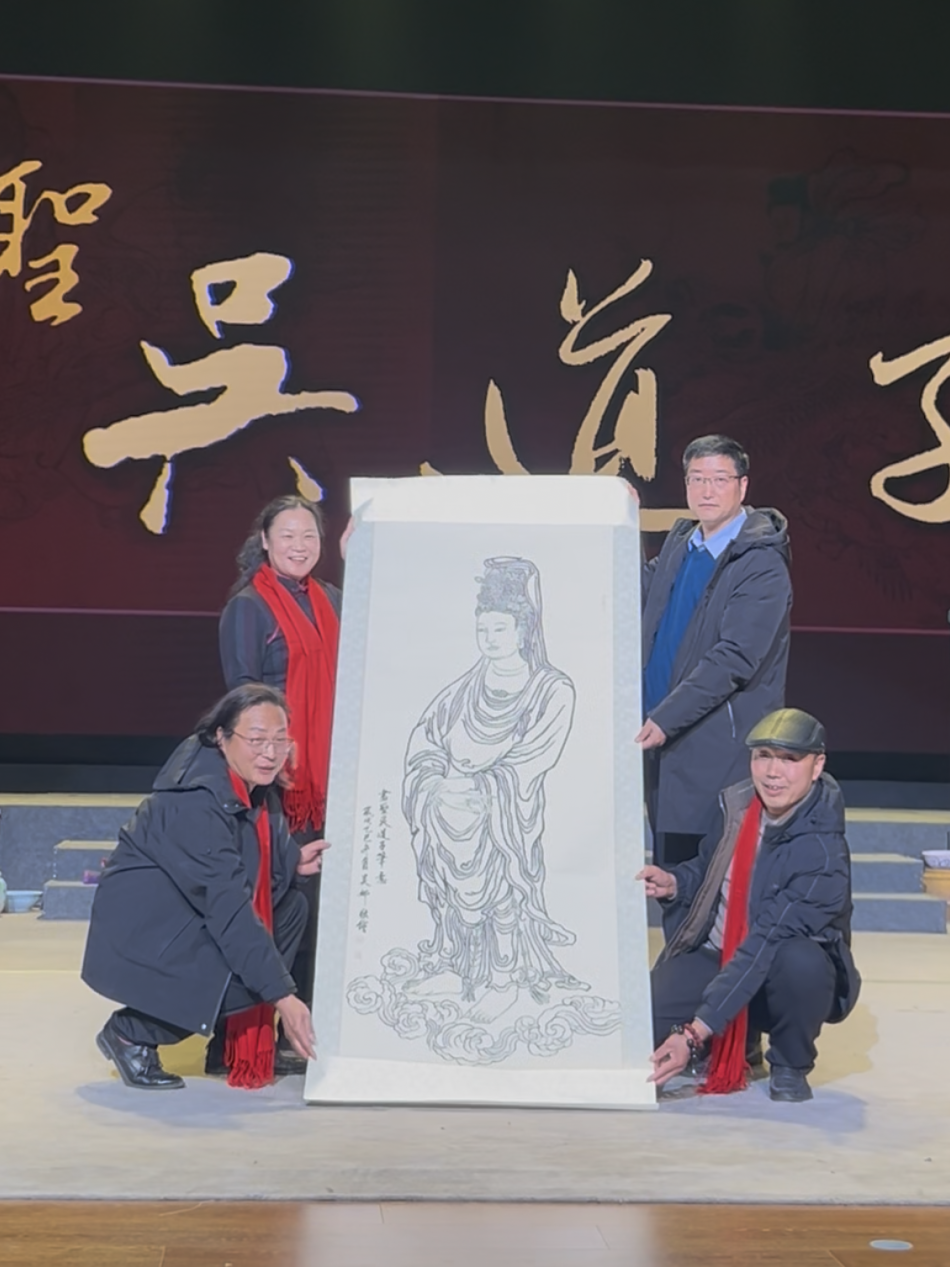 演出结束后,吴道子五十二代后裔、河南省非物质文化遗产《吴道子传说》项目省级传承人吴娜女士,代表吴道子艺术研究会向剧组捐赠吴道子画作《观音菩萨像》临摹作品。捐赠现场,她向禹州市文广旅局、豫剧团表达了诚挚谢意,感谢双方为宣传画圣事迹、弘扬画圣精神所做的努力。 接受采访时,吴娜对演出给予高度评价:“历史故事、历史人物很难演,禹州市豫剧团却演得极好!无论是唱腔韵味、服装形制,还是舞台呈现,都精准拿捏细节,把吴道子的艺术风骨和人物形象刻画得栩栩如生。非常感谢剧团用豫剧这一鲜活形式,让画圣文化走进大众,这份传承与坚守特别有意义。”
